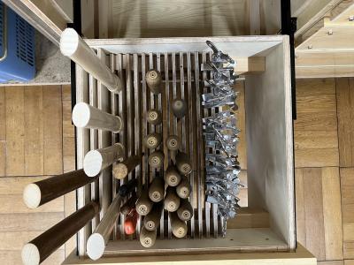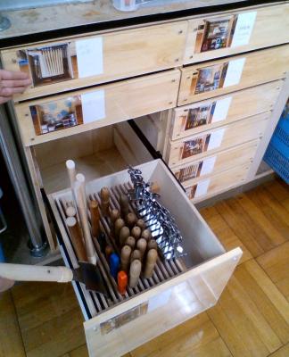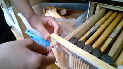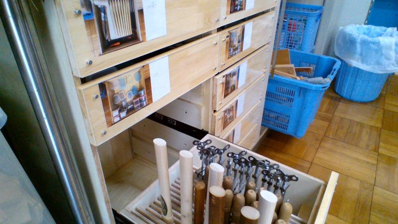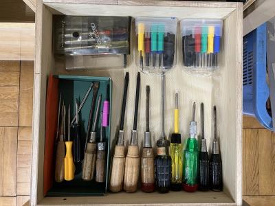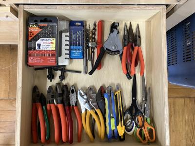 引き出しの前面に写真を貼り、その横に工具の名前を表示してありますね。写真ではよく見えなかったのですが、どの工具がどの名前なのかがわかるように表示されていますか。